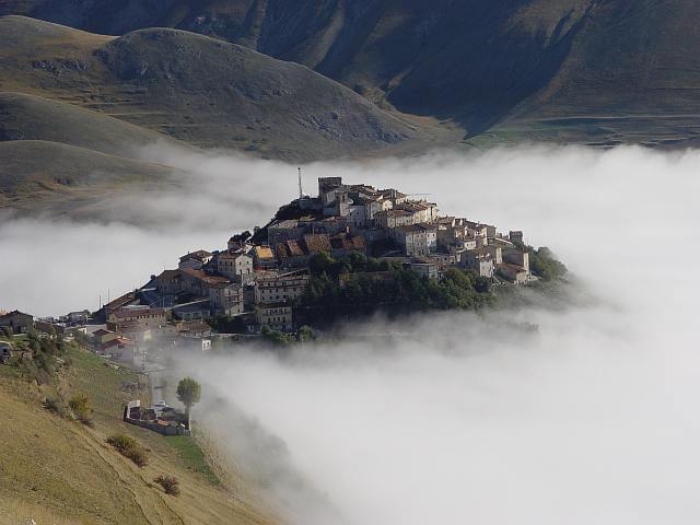 Castelluccio is built cleverly on a hill that reaches out of the fog early.